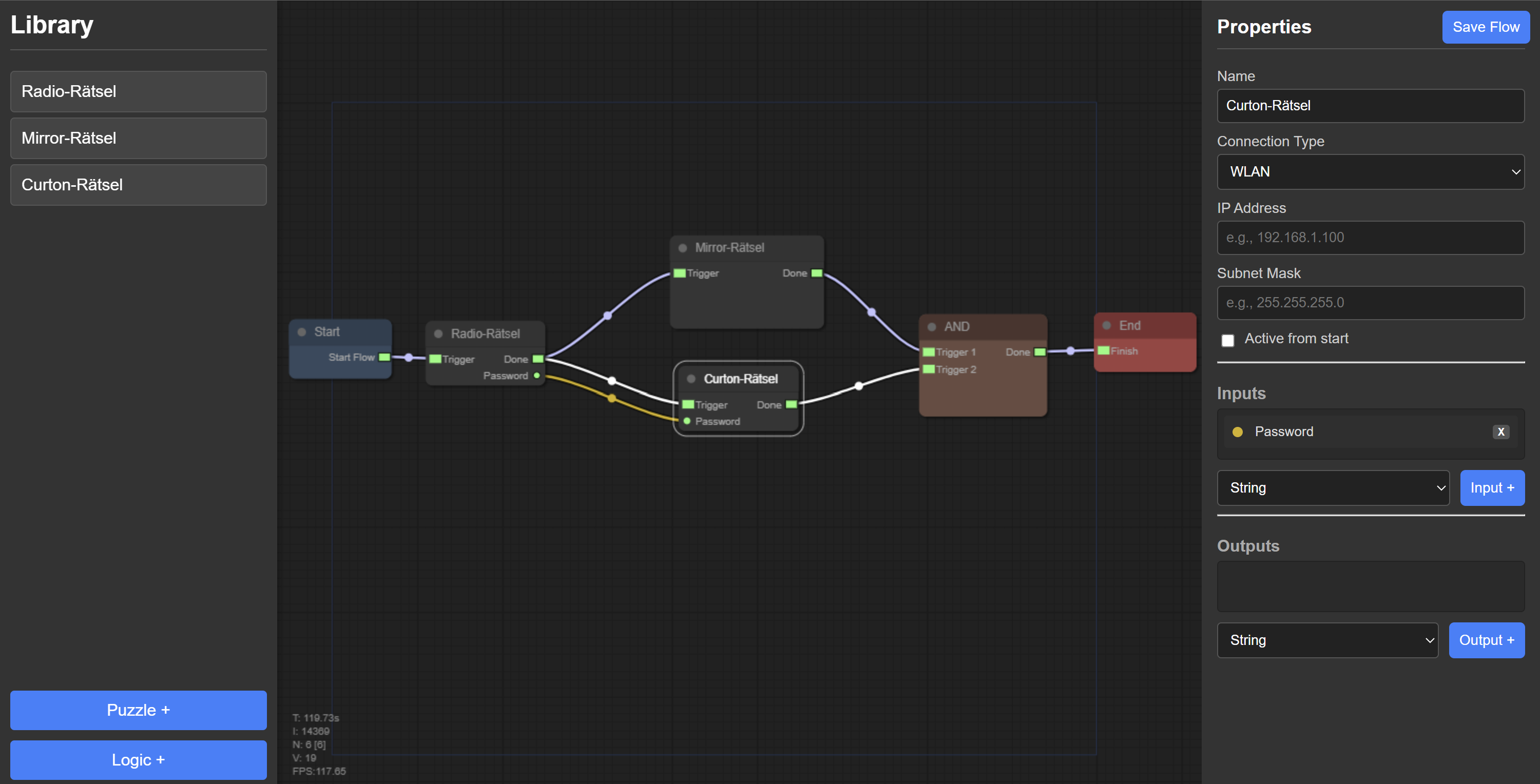 Nodes können Puzzles, Logik-Blöcke (AND/OR etc.) oder andere Elemente sein.