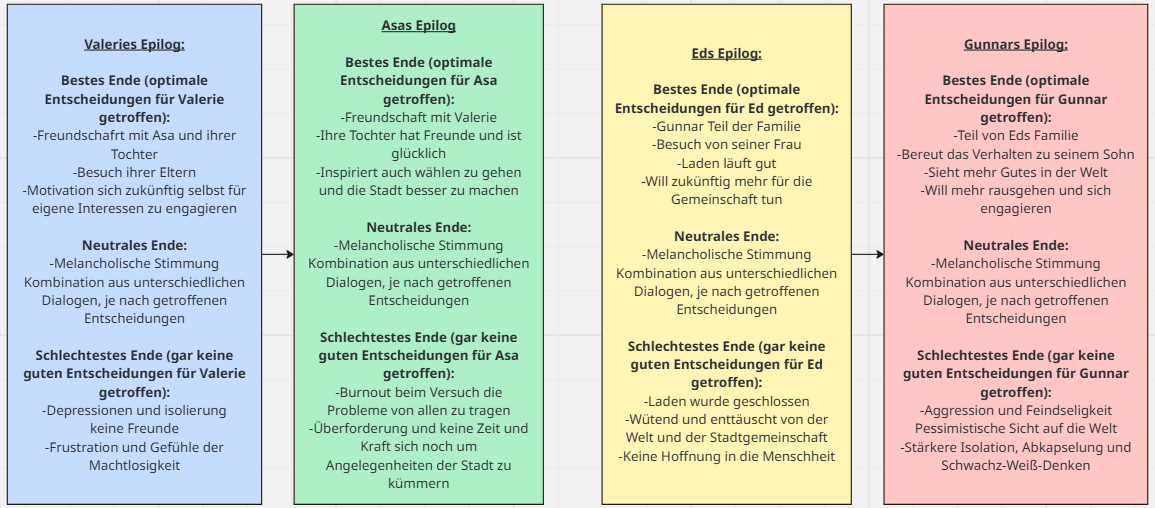 Nach dem letzten Ende kommt ein Epilog der einzelnen Charaktere der verschieden ausgehen kann, je nachdem wie gut man insgesamt die Stimmung und Lage der Kunden bzw. Bürger verbessert hat.