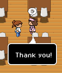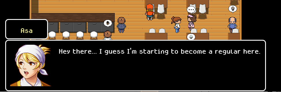 Ein weiterer kleiner Nachteil ist, dass unsere Charactersprites in Dialogen nur einen Gesichtsausdruck haben, was sich manchmal unglücklich mit den Dialogen kombinieren kann.
