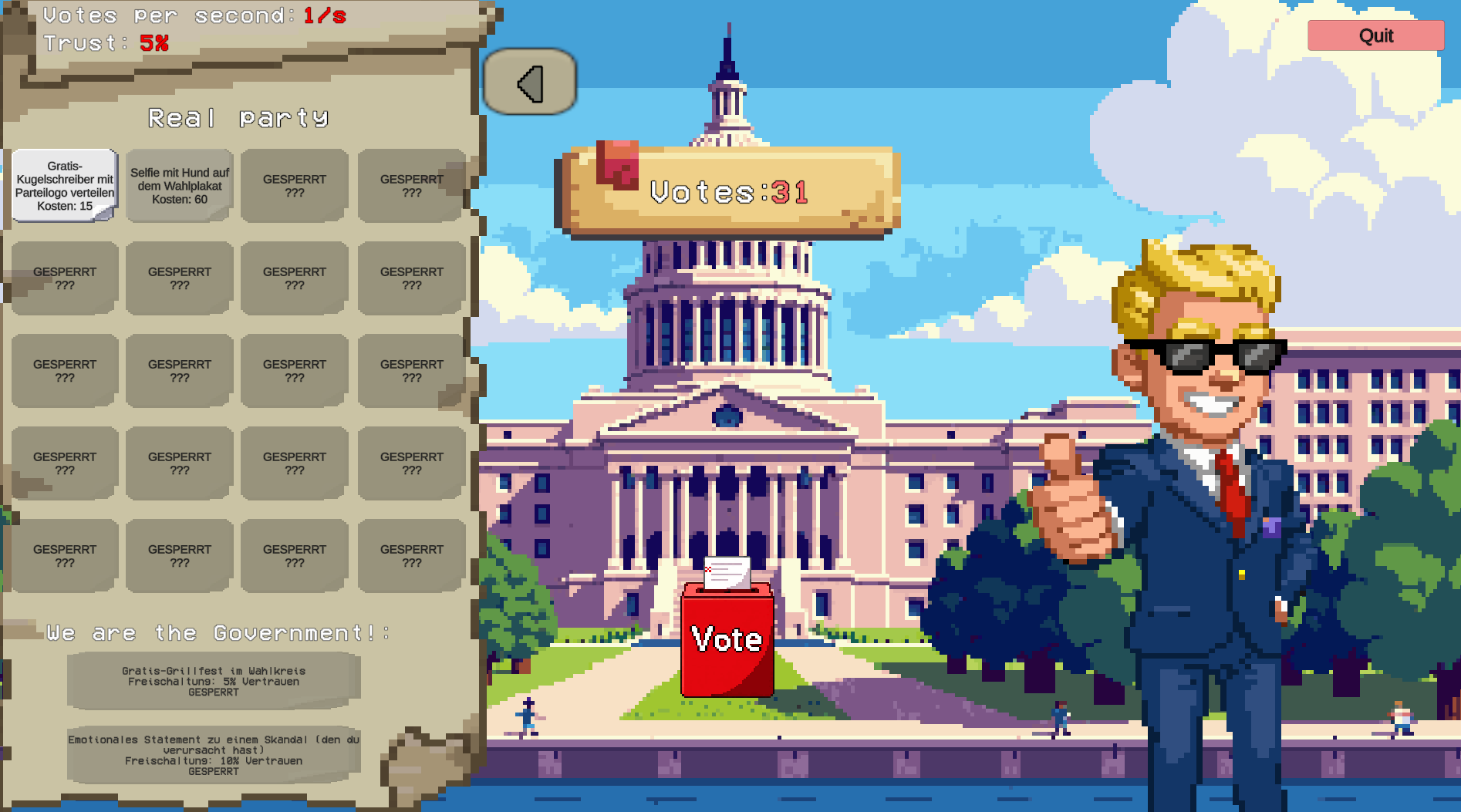 Klicke, um politische Zustimmung zu sammeln. Nutze Zustimmung, um politische Aktionen und einmalige Ereignisse zu kaufen, die deinen Einfluss steigern. Je mehr du investierst, desto schneller wächst deine Macht. Halte Ausschau nach einmaligen Gelegenheiten und Boni. Versuche, die politische Landschaft zu dominieren. Es kann auch sein, dass das Volk das Vertrauen in deine Partei verliert!