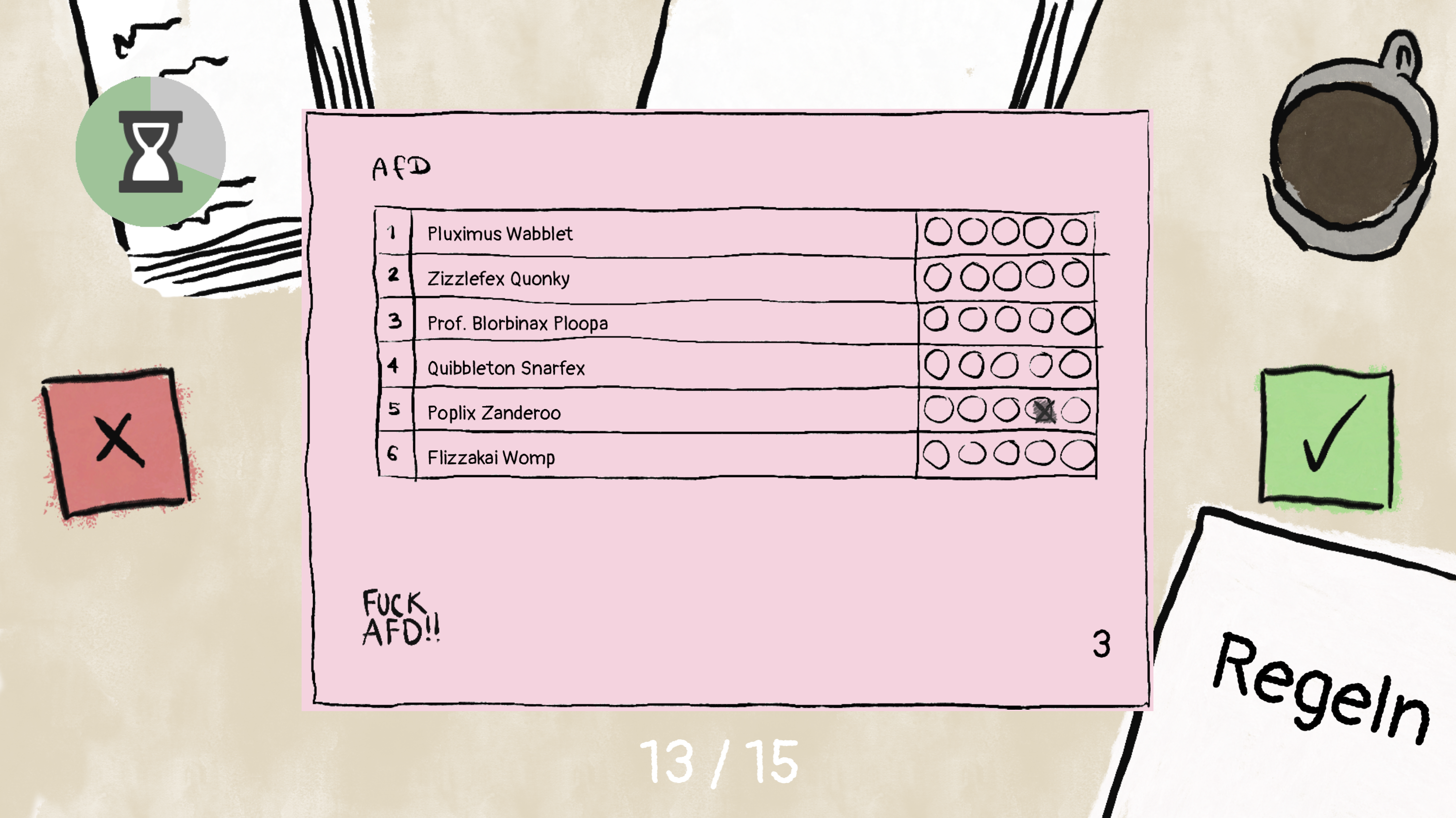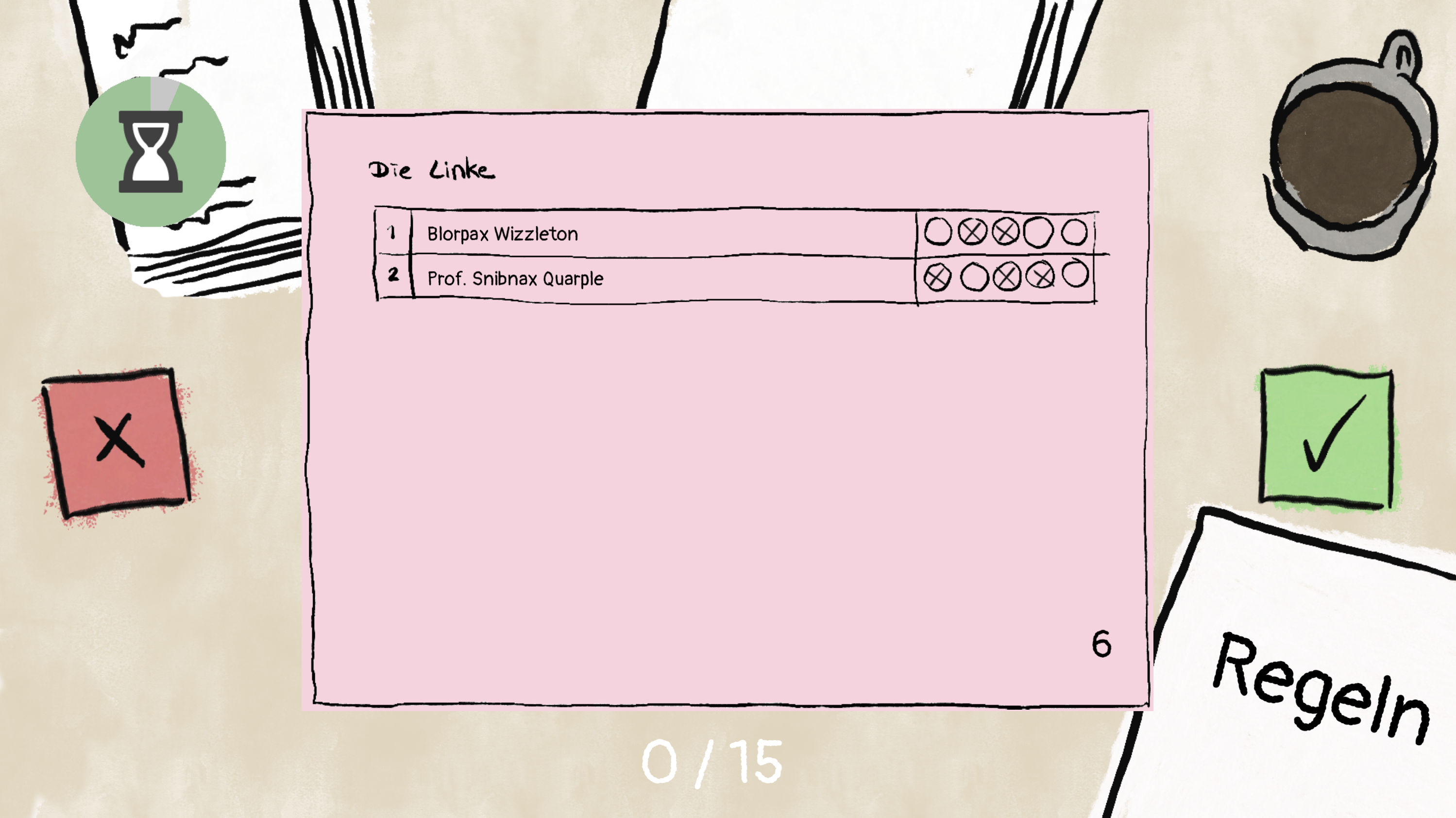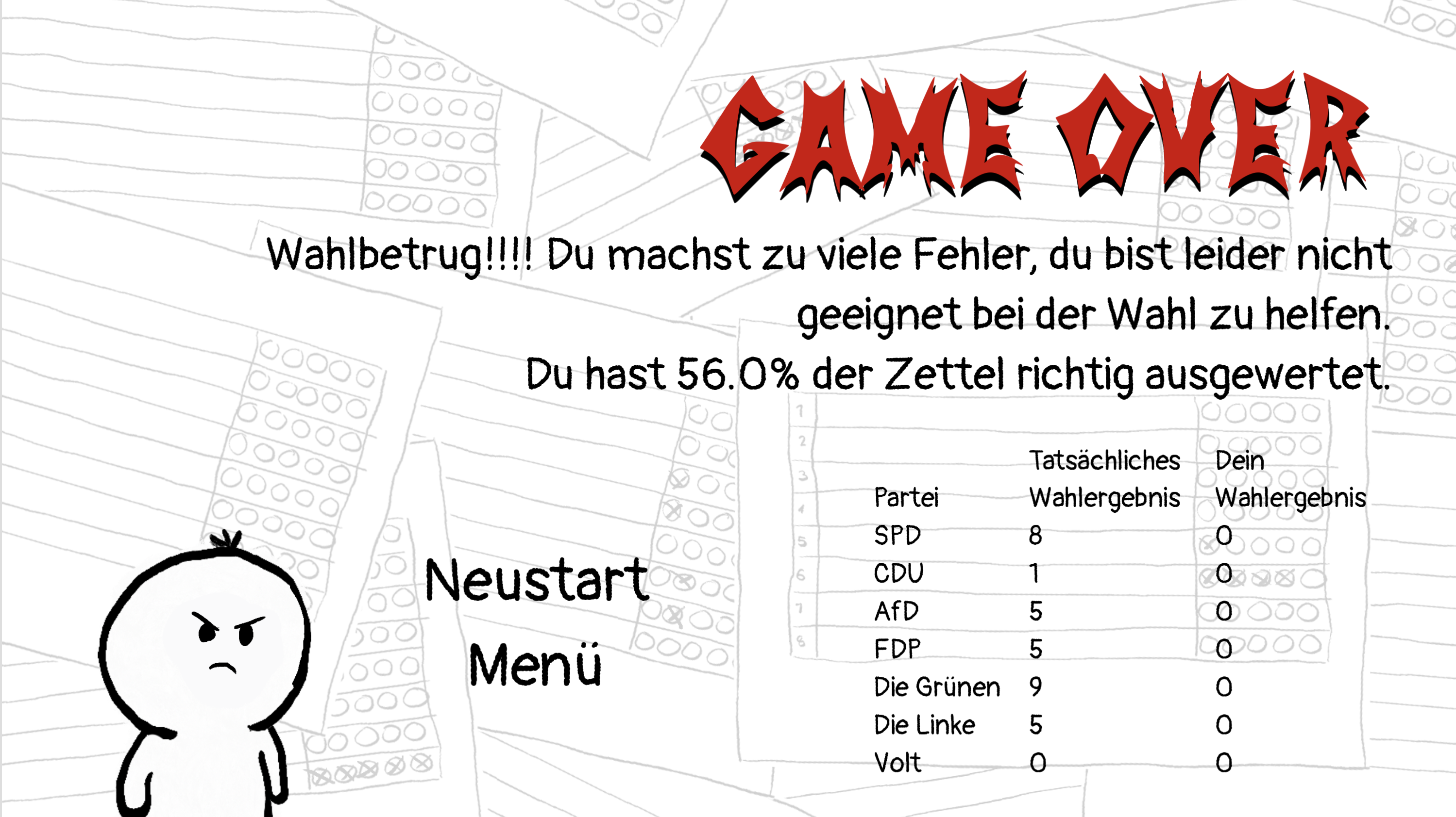 In diesem Arcade Sorting-Game musst du schnelle Entscheidungen treffen, ob ein dir vorgelegte Stimmzettel gültig ist oder nicht. Die Regeln sind simpel: swipe einen Zettel nach links, wenn er gültig ist und nach rechts wenn er ungültig ist. Für jeden richtig ausgewerteten Stimmzettel erhältst du einen Bonus, für jeden Fehler Zeitabzug. Machst du zu viele Fehler, wird dir Wahlbetrug vorgeworfen und du wirst disqualifiziert. Wenn du dir allerdings zu viel Zeit lässt, wirst du auch von der Wahlauszählung ausgeschlossen. Die Regeln nach denen ein Stimmzettelheft ausgewertet wird, kannst du während des gesamten Spiels einsehen. Manchmal bleibt dir allerdings auch ein bisschen Interpretationsspielraum überlassen. Als Grundregel gilt: Der Wille der wählenden Person muss klar erkennbar sein!
